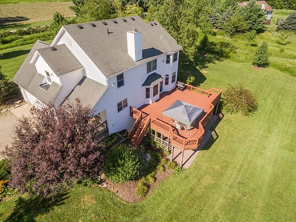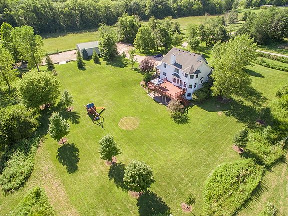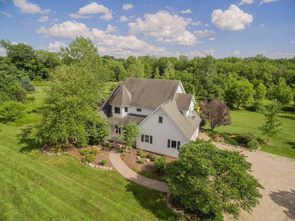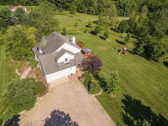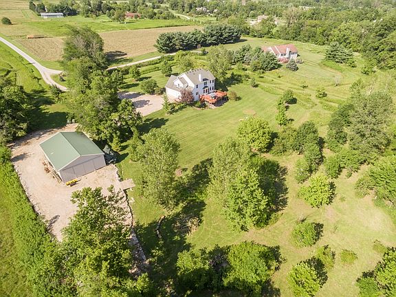 Designed and built by the custom builder as his personal home.....This secluded retreat is situated on 6.8 acres w/gardens, trees, and wooded trails! Quality features throughout include hardwood floors, granite counters/vanities, stained glass accents, crown molding, built in niches/shelving, 9 ft. ceilings, geothermal heating/cooling, and a unique 2-sty turret entry! The floor plan offers welcoming interior space with a large kitchen open to the great rm, living rm, 1st flr den w/built in cabinetry (constructed of vintage barn wood), 1st flr laundry, finished W/O LL w/rec rm and optional 4th BR, and three BR's upstairs including a deluxe master suite w/whirlpool tub! 30 X 50 outbuilding w/oversized door, workshop, and storage area, 24 X 28 deck, paver patio, and 2.5 car side load garage!