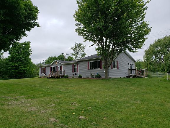 Welcome home! 3 bed 2 full bath ranch on 5 acres. Heated pole barn. Brand new ramp installed. Large family room added with pellet stove. Kitchen has beautiful hickory cabinets. 3 yr old forced air furnace and central air unit. 26' x 32' pole building has both an overhead door and large sliding door. It's complete with door opener, electric, concrete floor. Additional Amish style shed with metal roof for even more storage. Large backyard deck and fenced area behind the home and land beyond with deer, turkey and wildlife. All appliances stay. Has high speed fiber internet option at this location. As is where is.