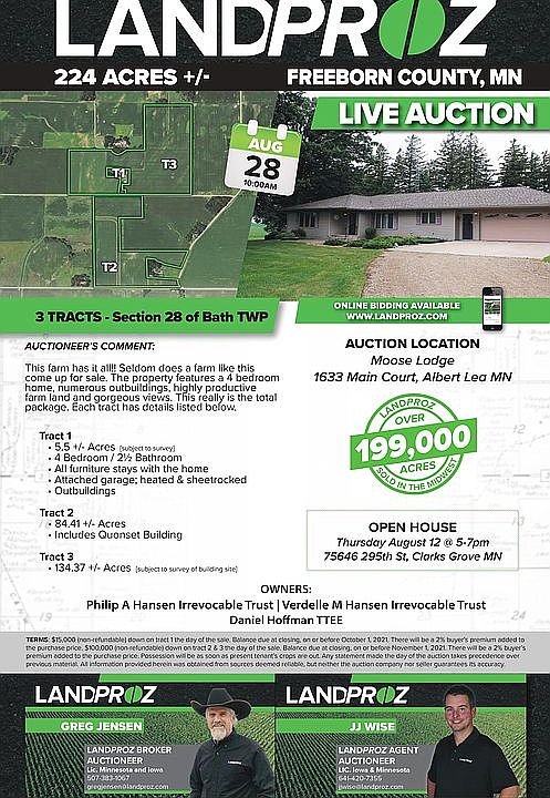 Online and live auction SATURDAY, AUGUST 28, 2021 10:00 AM ALBERT LEA MOOSE LODGE 1633 Main Court, Albert Lea MN 56007 Beautiful farm on 5.5 acres of land. All furniture stays with the home. It has: • Home Security System • Gas fireplace • Patio pavers • Vaulted ceilings • Upper & lower family rooms • Attached garage; heated & sheetrocked • Grain storage • Outbuildings • Single car detached garage • Main machine shed: Measures 35.5' x 48'. Cement floor. Steel. High door 12' x 12'. GDO. Elec 220. • Large building: Measures 24' x 56'. Dirt Floor. Steel. Sliding door 6' x 8'. GDO. • Quonset/Barn: Measures 36' x 50'. Cement floor. Steel. Large sliding door. • 4 Bins & shed/chicken coop • Small shed surrounded by mature trees • Septic plan • Up to an additional 3 acres can be purchased at bid price of surrounding farm OPEN HOUSE Thursday August 12, 2021 from 5:00PM-7:00PM Here's a full 3D tour of the house. Feel free to call with any questions. https://my.matterport.com/models/84w8oYdFZUc?section=media