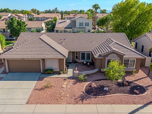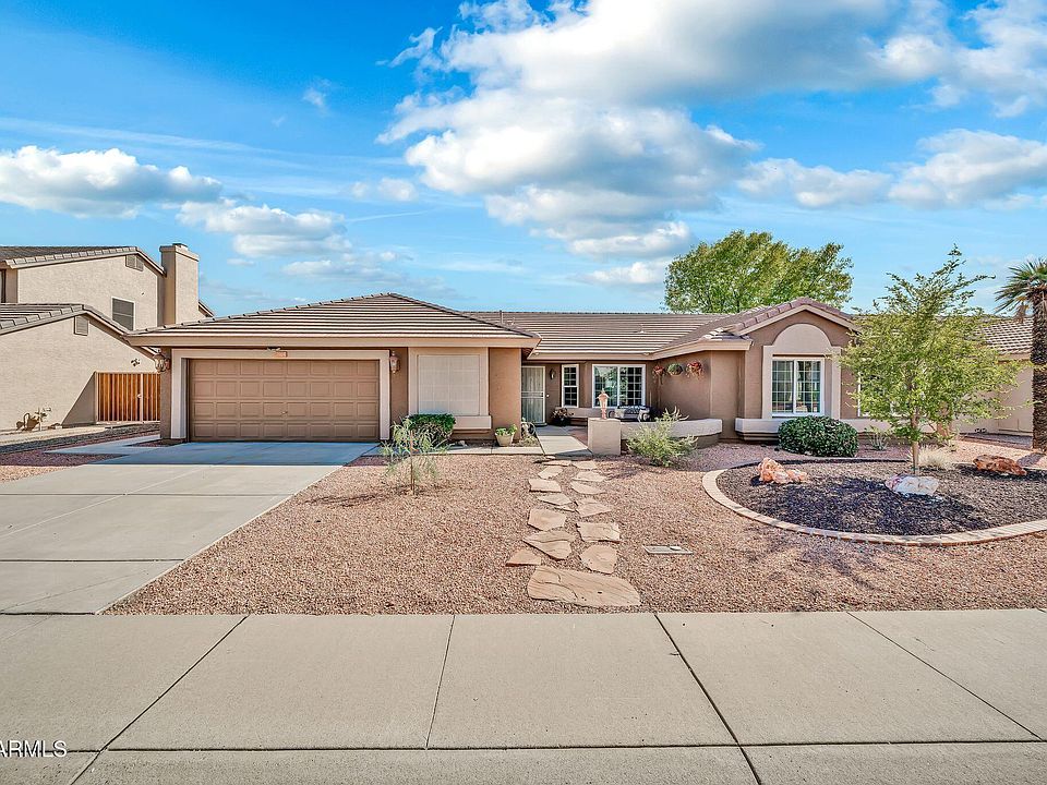 Large single story beauty in desirable Lion's Gate community in Peoria. A gracious front flagstone patio welcomes visitors to this spacious split layout 4 bedrooms home. Formal living and dining area, updated eat-in kitchen with granite counter and breakfast bar. Large family room for gatherings. Three generous sized bedrooms on one side of the house. Primary bedroom features a sitting area, walk in closet, jetted soaking tub and beautiful shower with rainhead and bench. Oversize 2.5 car garage offers plenty of storage. Big backyard with grassy area. a covered patio runs the full length of house. Newest updates are dual pane windows and solar screens.