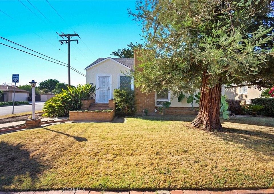 Welcome to this delightful Montebello home situated on a spacious corner lot featuring a grand Redwood tree. As you enter, you’re greeted by beautiful real hardwood floors full of potential and warmth. Step down into the inviting living room, where natural light pours in through stunning original floor-to-ceiling muntin windows, showcasing a grand fireplace as the centerpiece. The adjacent raised dining area shares these charming windows and features a lovely crystal chandelier that adds elegance to every meal.