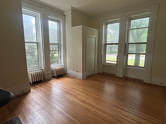 The large bedroom is a true retreat, complete with built-in bookcases, a decorative fireplace, and abundanence of windows that flood the space with natural light while offering views of East Ave.