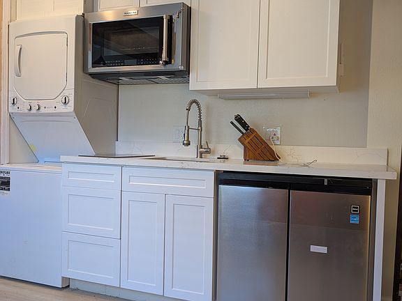 In-Unit Laundry: A stacked washer and dryer unit is conveniently located next to the kitchen.