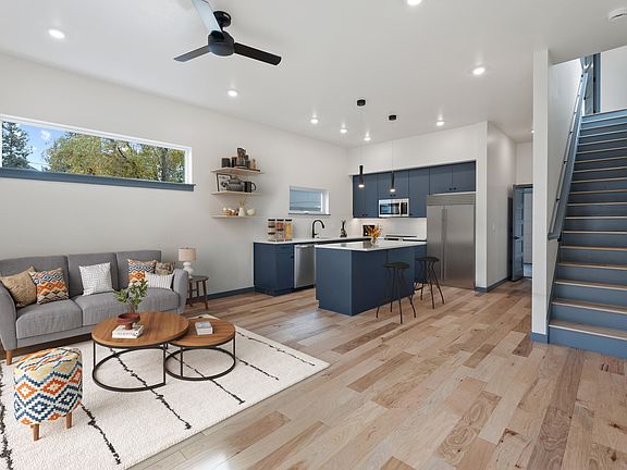 Just around the corner from Bend's iconic Old Mill District, this move-in ready, new Hiatus home, designed by 2024's High Performance Builder of the Year, offers exceptional design and an unbeatable location. Inside, vaulted ceilings and expansive windows highlight quartz countertops, stainless steel appliances, custom cabinetry, and engineered hardwood floors. Bedrooms are true dual primaries, each with its own ensuite bath. Net-zero ready, this home scores 10/10 HES and includes advanced insulation, fiberglass windows, a durable metal roof, efficient mini-split heating and cooling and an EV-ready garage.