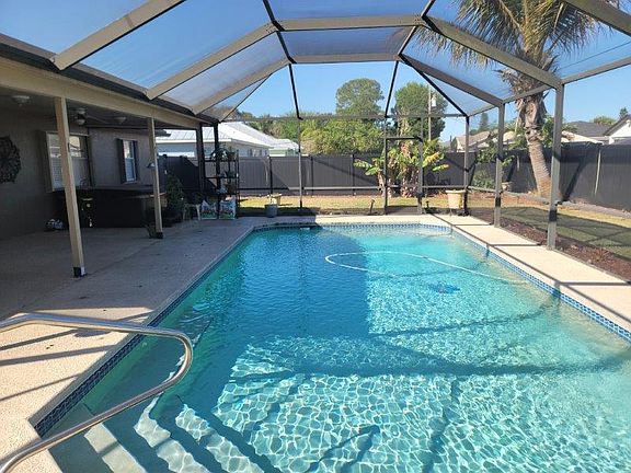 This 3/2/2 pool home has an extra wide driveway to fit a boat or RV. Brown Vinyl Fence installed in 2021. Lush landscaping and a rainbird irrigation system. A/C was replaced in 2019, new roof in 2023. Newer water heater, Accordian shutters for the whole house. Nice kitchen with an eat in area. Formal Dining Room. Family room, Living room/ Office workspace. Tile throughout the home. Owner suite has a jetted tub to relax in. An inside laundry room with washer and dryer. Sliders to the outside patio where you can sit and relax by the pool or in the hot tub. AND the house is equipped with Trim Lights!! Please note that this property was independently appraised.