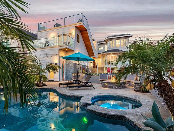 Newly completed in 2025, this coastal estate blends upscale beach house modern architecture with cutting-edge technology, luxury materials, and thoughtful design—just a short stroll to the beach, Village shops, dining, and top-rated schools. Over 3,400 sq ft of designer living space features wide-plank white oak floors, a steel-and-glass mono-stringer staircase, remote-controlled fireplaces, and a full indoor/outdoor SONOS audio system offering immersive sound throughout. The upgraded kitchen is a showpiece with Sub-Zero and Thermador appliances, oversized waterfall quartz island, custom cabinets, lighting and water filtration system. The serene primary suite offers a marble spa bathroom, soaking tub, fireplace, boutique walk-in closet with quartz island, and ocean-view sitting area. Two guest bedrooms are located on the second floor. The backyard is a resort-style oasis with multiple entertaining levels, saltwater pool and spa, fire pit, commercial-grade slide, built-in BBQ/bar, and dedicated lounging and dining areas. A California-style outdoor shower sits just off the pool, along with a poolside bath and storage. The rooftop deck offers panoramic views, second built-in Bull BBQ, fridge and sink. A 1,000 sq ft ocean-view guest casita includes private exterior access and an interior stairwell to the main home. It features a spa bath, soaking tub, kitchenette, Smart TV, walk-in closet, loft, and balcony. 21 panel solar system, dual-zone HVAC, smart home technology, full security, and custom 2-car garage. Design and living elevated. La Jolla Village living—redefined.
