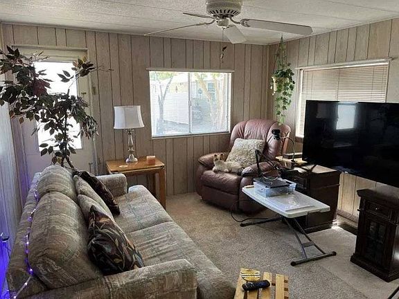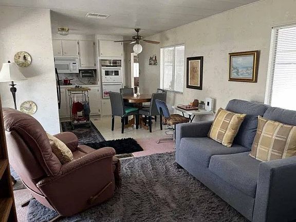 AN ADORABLE 2 BEDROOM HOME. Just listed Available furnished or unfurnished. This home has it all going for it and if you walk into the home you will see that it has been well taken care of. The kitchen has the refrigerator, range and over-range microwave oven. The bedrooms are nice sized and will fit a queen size bed, There is an add-on to the home that features a nice sitting area and laundry room. The outside of the home has a good size shed and patio area. Plus there is a natural gas grill that is conveniently located directly off the sliding glass door. The driveway side of the home has sun screens installed to protect your vehicle from the sun.. This house is priced to sell quickly. Price of home will be established if it is sold furnished or unfurnished.
