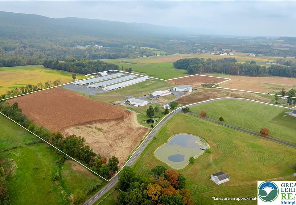 Turn Key Poultry Farm Opportunity! Rare chance to own a fully operational and income producing chicken farm set on 28+/- acres in Lynn Township, Lehigh County PA. This property is designed for efficiency and profitability offering everything you need to continue production on day one of ownership. 3 well maintained 63' x 500' commercial Bell & Evans Farmer Boy Houses with modern equipment, automated feeding, watering systems and ventilation. Several outbuildings including a heated 50x80 custom stick built workshop garage with two 14x14 bays, three 10 x 10 bays and poured concrete floor. Workshop has propane heat, on demand hot water, full bathroom w/ shower in addition to an outdoor wood furnace. 60' x 100' Equipment Shed with 20' x 50' addition, loading dock and storage. 60' x 120' Hay storage shed, 33 ft grain bin, large bank barn and much more. Approximately 16 tillable acres in addition to Owner's 3 bedroom 2 story Farmhouse residence and separate secondary 3 bedroom helper/worker residence providing perfect live where you work opportunity. Reliable well water with 3 onsite wells, updated electric and 3 separate backup generators for uninterrupted operations. Large pond is a bonus! Don't miss this rare opportunity to step into an established agricultural business with all the infrastructure in place. Currently in Farm Preservation and Act 319 Clean & Green. Schedule your private tour today and explore the full potential of the income producing Farm!