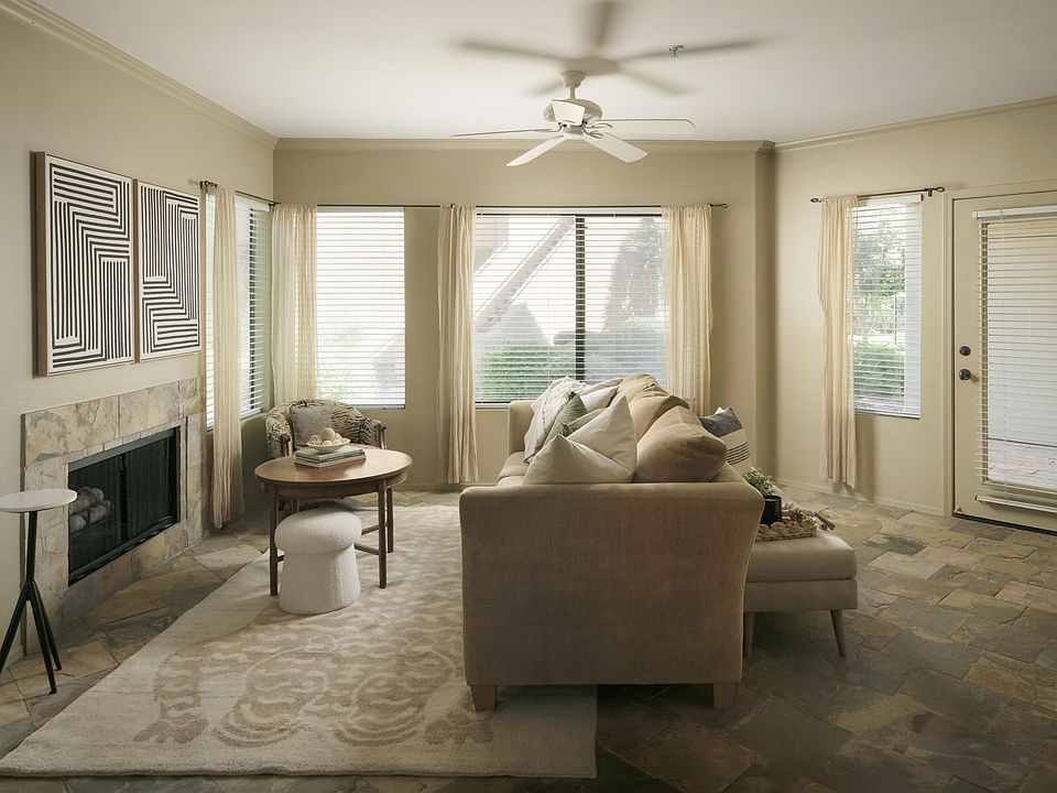 Cozy wood-burning fireplacePremium corner unitUltimate privacyPrivate patio accessWalk-in closetKitchen features granite countertopsSpa-like shower