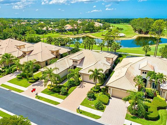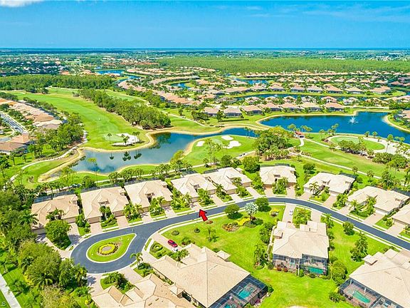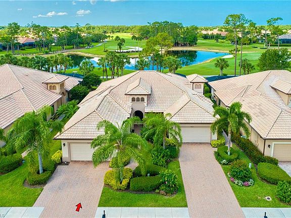 Spectacular golf course and lake view from this lovely attached villa. This stunning home features three bedrooms. Master bedroom has highly upgraded closet. Two full bathrooms. Open kitchen area has stainless appliances, granite counter tops, and upgraded cabinetry. Wine cooler is conveniently located in the great room. Tile in living area and beautiful hardwood floors in all bedrooms. Tray ceilings, crown molding and updated lighting. Generous screened in lanai for extra outdoor seating. No pool to repair or maintain. Upgraded electric shutters on the lanai and accordion shutters on remaining windows. Beautiful accent lighting illuminates exterior landscaping. Spacious two car garage. Convenient central vacuum system. Extra wide lot. Lot has enough room to build a pool. Home exterior was painted in 2021. Home is being sold unfurnished. Enjoy the membership to the Players Club and Spa. Club offers 3 swimming pools, tennis courts, pickle ball courts, an amazing fitness center, a tiki bar, a restaurant and a full social calendar. A Lely Lifestyle not to be missed!