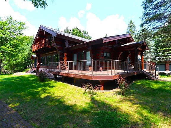 Stunning Scandinavian log home on Fisher Lake. Boasting 3 BR & 4 BA, w/grand entryway that leads into spacious great room, striking stone fireplace, handcrafted chandelier & captivating lake views. Elegant dining area, chef’s kitchen w/quality refrig, gas cooktop, built-in oven, dual dishwashers & convenient eat-at workstation. Master BR w/ its own gas FP, walk-in closet, BA & picturesque lake vistas from the glass-enclosed porch. Guest BR, bath, h/w floors, charming back glass porch. Ascend to upper loft for plenty of sleeping quarters, sitting area, BA, half log staircase. Entertainment abounds the walk-out lower level, w/sprawling rec room, wet bar, media area, FP, bath & multiple game zone areas. Det 3-car full log gar, expansive 4-car gar w/extra-high ceilings & loft area. Serene sun deck overlooks 178 ft sandy shore, 3.37 acres park-like grounds. Easy access ATV snowmobile trails, Fisher Lk 3-Lake Chain w/fishing, boating on full rec lake. You found paradise!