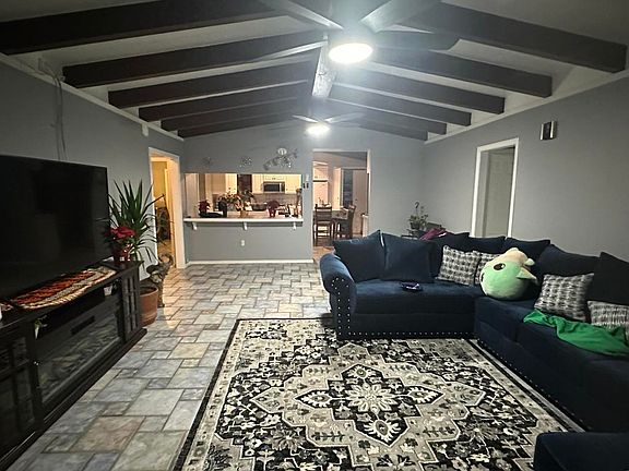 Welcome to a remarkable 5-acre ranch-style retreat offering stunning 360 mountain and desert views. This 2,000 sq. ft. home features 3 bedrooms and 2 bathrooms, a country-style kitchen with breakfast bar, tiled flooring, beamed ceilings, and a cozy wood-burning stove. A 60-ft covered front porch creates the perfect setting for enjoying vibrant sunsets, moonlit nights, and starlit skies, making this property both peaceful and picturesque.The property is designed with versatility in mind, featuring RV parking, a covered carport and work area, plus two 40-ft storage containers for added convenience. Zoned for agriculture and equestrian use, it's ideal as a private ranch, creative retreat, or Airbnb investment. Whether you envision a serene getaway, horse property, or unique desert lifestyle, this home delivers unmatched privacy, space, and rustic charm.