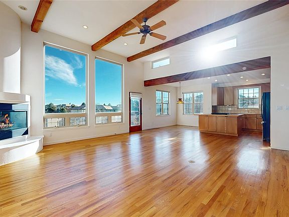 - Description: 12 Ft Ceilings With Beams, Corner Gas Fireplace, Large Windows