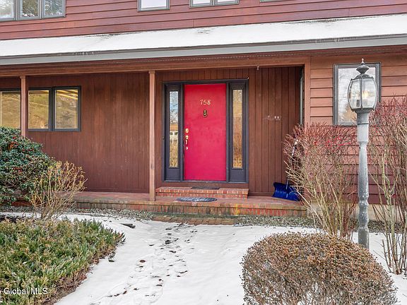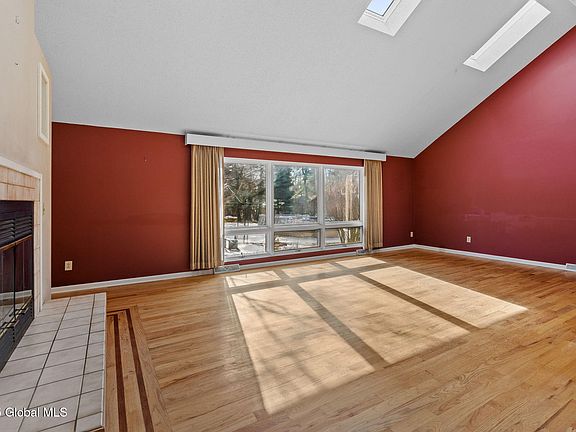 This stunning contemporary home offers a bright, open layout with soaring vaulted ceilings and five skylights that flood the living and dining areas with natural light. A wood-burning fireplace adds warmth, while the gourmet kitchen boasts an island, quartz countertops, and pull-out cabinets. Hardwood floors grace the main living areas, with plush carpet in the bedrooms. The first-floor primary suite features a spa-like ensuite and walk-in closet. A sun-drenched family room with walls of windows overlooks the picturesque nearly 1-acre property. A circular driveway adds convenience, while a full basement and 10-inch walls ensure ample storage and exceptional energy efficiency.