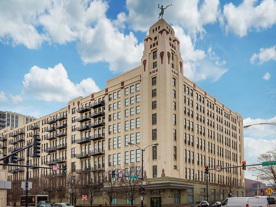 Absolutely stunning and thoughtfully upgraded 2-bedroom loft in the heart of River North! Located in One River Place-an iconic Art Deco gem built in 1929 and converted to condominiums in 2002-this home combines historic character with modern convenience and 24-hour door staff. The spacious split-bedroom floor plan offers 2 full baths and a gorgeous custom chef's kitchen with rich cabinetry, stainless steel appliances, and an oversized granite island-perfect for cooking and gathering. Just off the kitchen, a generous dining area flows into the living room, complete with east-facing city views, a cozy gas fireplace, and direct access to your private patio. Both bedrooms are generously sized, including a luxurious primary suite with abundant closet space and a spa-like bath featuring a dual vanity. A convenient laundry closet adds everyday ease. Building amenities elevate the lifestyle with a massive rooftop deck with gas grills and panoramic skyline views, plus a well-equipped fitness center. Deeded garage parking available for $25K.