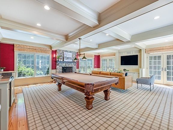 Gas fireplaceFieldstone fireplaceVaulted ceilingFamily roomBright kitchenCoffered ceilingFinished lower level playroom