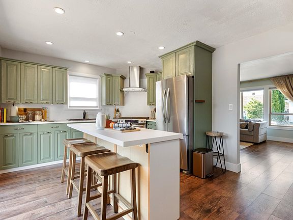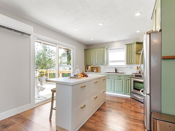 Good-sized lotWood-grain laminate floorsCustom green kitchen cabinetsNewer patio doorsNewer roofLarge patioLandscaped fenced yard