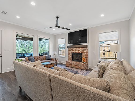 The minute you enter the beautiful foyer with herringbone design tile floors you will see the backyard treed/green space from the open concept of the kitchen, breakfast, and family room with gas log hearth fireplace. Windows (with remote shades) look out to the outdoor living patio with beaded ceiling, stained concrete, ceiling fan, built in gas grill, frig, and counters for prepping. The brick lined steps and wrought iron railings take you down to the huge yard with brick edged flower beds and gorgeous azaleas. The spacious master bedroom with tray ceiling, ambient lighting, and remote shades on the windows viewing the peaceful beautiful backyard /trees. The kitchen has tons of cabinets all the way to the ceiling, double ovens gas cooktop, corner pantry, quart counter tops, breakfast bar with seating . The breakfast area has plenty of room for dinner when you have guest and view beautiful backyard. Master bath has quartz double vanities, tiled shower with herringbone design , tiled floors, soaking tub, and linen closet. Huge Master closet is an amazing dream with built ins for shoes and chest with drawers. Utility room is outside of closet with loads of cabinets and countertop. The Mud area outside the utility and by the garage door is a plus. On the opposite side of home are two bedrooms with carpet one of which has a vaulted ceiling being used as an office and guest room, recessed lighting, ceiling fans, and well designed closets. Full bathroom has beautifully titled tub/shower and vanity with quartz. Other amenities include security system, sprinklers, entry closet, garage storage closet, Generator, and tile (looks like wood) floors. It is located close to walking trails, Fresh, shops, and restaurants. You will love the location! Make this beautiful quality custom built home yours. Call today for a private showing. YOU'VE ARRIVED !