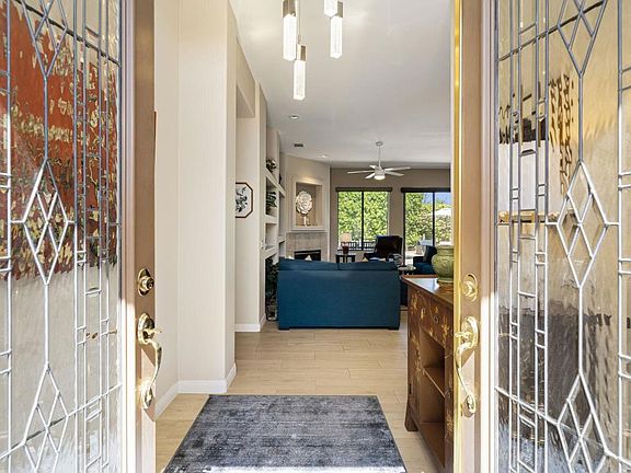 Ready to call this place home! This home is located in the interior of the development. A private courtyard with custom pavers leads you to stylish double-pane glass entry doors, inviting you into a home filled with natural light and an airy, open feel. The spacious living room showcases wood-look porcelain tile flooring throughout, with walls of glass and sliding doors that frame serene views of the backyard and sparkling pool. The social kitchen is perfect for entertaining, granite countertops, stainless steel appliances, and a large pantry. A cozy breakfast area adds to the charm. Two generously sized guest bedrooms share a bathroom with a double vanity and walk-in shower--ideal for family and friends. The expansive primary suite offers direct pool access through sliding glass doors, along with a luxurious bathroom boasting dual vanities, a new shower, a freestanding tub, and a walk-in closet. For added flexibility, the attached casita with its own private courtyard entrance makes an excellent office, guest retreat, or in-law suite. The backyard is your private oasis, beautifully landscaped with citrus trees, complete with an upgraded pool system for easy enjoyment. A bonus room provides space for a gym, office, or creative studio. Additional upgrades include: owned solar system, new window treatments throughout, new kitchen sink and faucet, enhanced landscaping.This home is centrally located by many golf courses. Only a golf cart away from Toscana and Indian Ridge. Plus minutes away to Desert Willow and PD Resort.