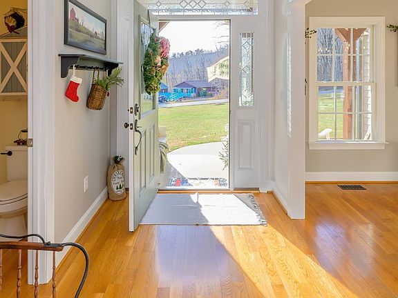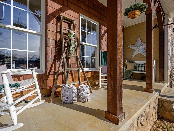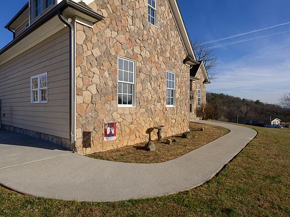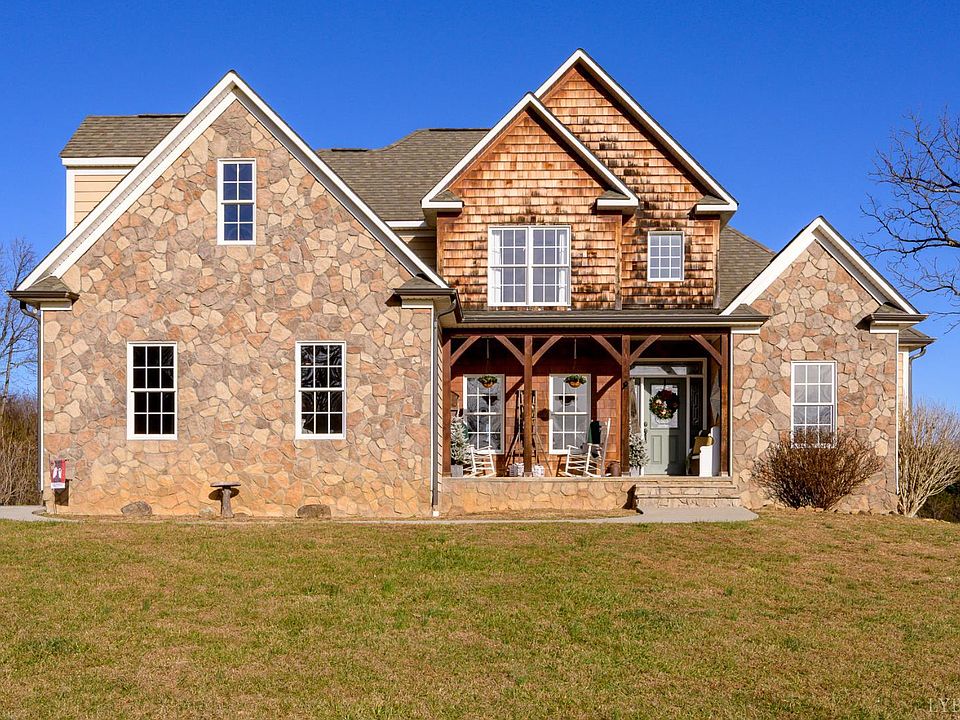 Just 10 minutes from Bedford, this home offers sweeping views of the Peaks of Otter providing 6 usable acres ideal for a farm hobbyist, plus a seasonal creek. The thoughtful layout supports multi-generational living with a second main-level suite. Exterior highlights include a stone front, covered porch, and a spacious deck capturing mountain vistas. Inside, the open foyer leads to hardwood floors, a formal dining room, half bath, and a great room with cathedral ceilings and a floor-to-ceiling stone fireplace. The kitchen features custom cabinetry, granite counters, walk-in pantry, LG stainless steel appliances, and a bright breakfast area. The main suite offers double vanities, a tiled shower, jetted tub, and a walk-in closet. Upstairs you'll find two bedrooms, an office nook, a full bath with double vanities, a bonus room with dormer windows. Don't miss the adjoining 3-acre parcel that conveys, an ideal setup for your hobby farm.