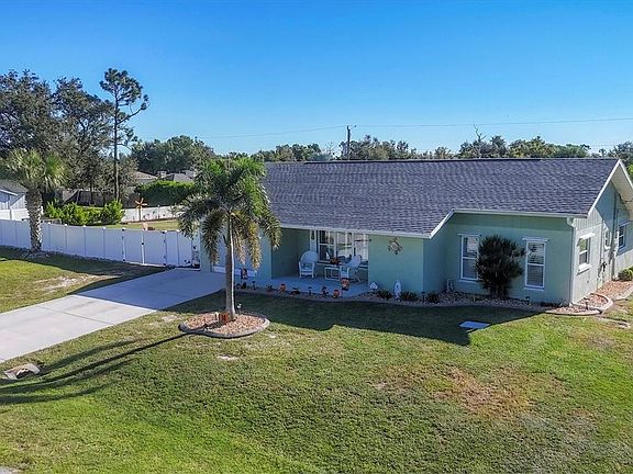 Beachy, Quiet & Private Coastal Retreat on a Double Lot! This charming, move-in-ready home offers the perfect blend of coastal charm and modern updates. Nestled on a double lot in an X flood zone for added peace of mind, this beautifully maintained property partially fenced, provides a true sense of privacy and relaxation. Step outside to your own backyard oasis featuring mature tropical landscaping, a firepit area, two newer sheds (2021 & 2022), and a sparkling screened-in pool, ideal for year-round enjoyment. Designed for seamless indoor-outdoor living, the home boasts an inviting covered patio overlooking the pool and sliding glass doors that fill the interior with natural light. Inside, the oversized living room welcomes you with a large picture window and plantation shutters, creating a warm, coastal ambiance. The updated kitchen showcases modern finishes and a large pantry, while both bathrooms have been beautifully renovated with modern finishes and a fresh, beachy feel. Recent upgrades include a new roof and AC (2023), updated plumbing and electrical, and hurricane shutters ensuring comfort and worry-free living. A screened lanai adds yet another relaxing space to enjoy the laid-back Florida lifestyle. Perfectly located near the pristine beaches of Englewood, as well as golf courses, shopping, dining, and entertainment, this coastal gem is ideal for those seeking a private retreat or the ultimate space for entertaining. With timeless style, thoughtful updates, and an exceptional location, this beautiful home won’t last long!