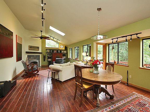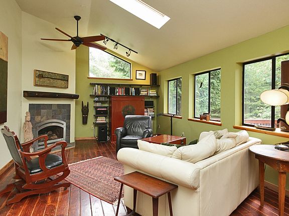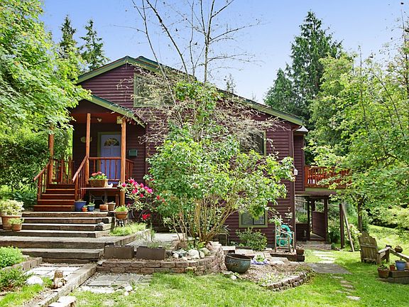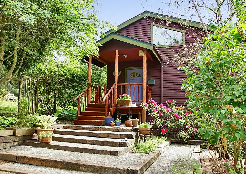 Adorable sunny 3 BR home tucked away on 2.5 private wooded acres with fenced organic gardens, fruit trees & chicken coop! Renovated kitchen, baths & new roof in 2013, this home is move in ready for year round or a weekend retreat. Separate 2 room art studio w/bamboo floors & skylights. Daylight lower level w/lovely 2nd kitchen, BR/LR, bath covered porch & separate entrance. Charming cottage perfect for writing. 2 decks for bird watching or dining. 10 minutes to ferry or Langley. Very Special!