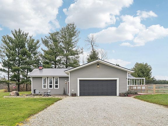 Experience the charm of this ranch-style home situated on 6 picturesque acres. Inside, you'll find an inviting open-concept layout featuring a cozy wood-burning fireplace that anchors the living room, seamlessly flowing into the kitchen and dining area. The fully applianced kitchen includes a gas range, refrigerator, dishwasher, and beautifully updated cabinets.