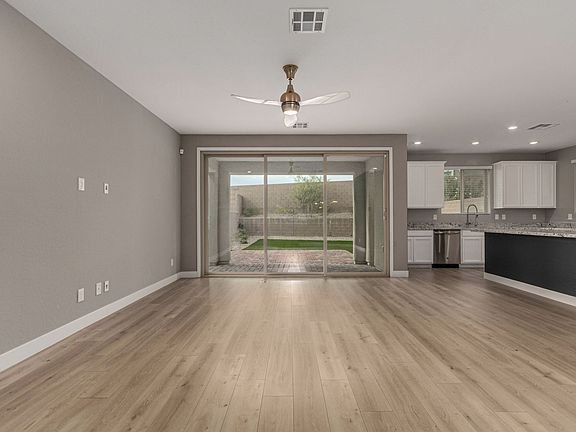 Beautiful 3-bedroom home in a gated Summerlin community. This property features an open floor plan with living, dining, and kitchen areas combined for easy flow, plus a large glass slider that brings in natural light and opens to the newly installed backyard. The kitchen includes white cabinets, granite countertops, and upgraded stainless steel appliances. LVP flooring is throughout the first level, with a ceiling fan in the living room and a chandelier in the dining area.