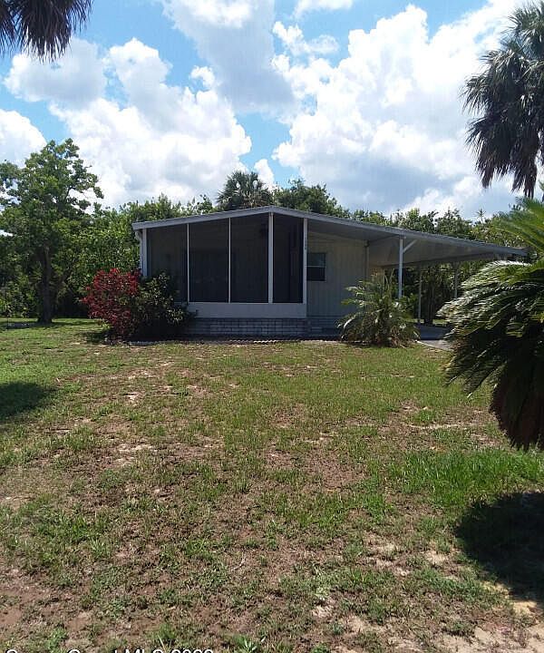 NICE!!! 2 bedroom, 1.5 bath with a large front yard and a large screened front porch.(new screens & painted porch coming soon) New Roof! New flooring! New appliances! Privacy and comfort across from the river for boaters. Very long driveway and carport for several cars or motorhome. 2 sheds. ( attached, 1 detached ) detached in back can be used for a Workshop. You Own the Lot/everything. Low HOA provides a Large Pool and Clubhouse by a Lake.
