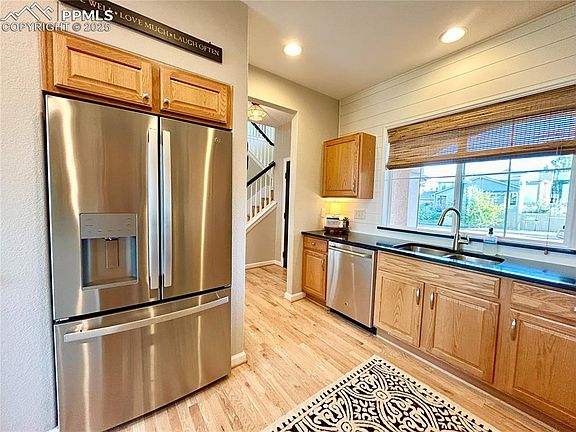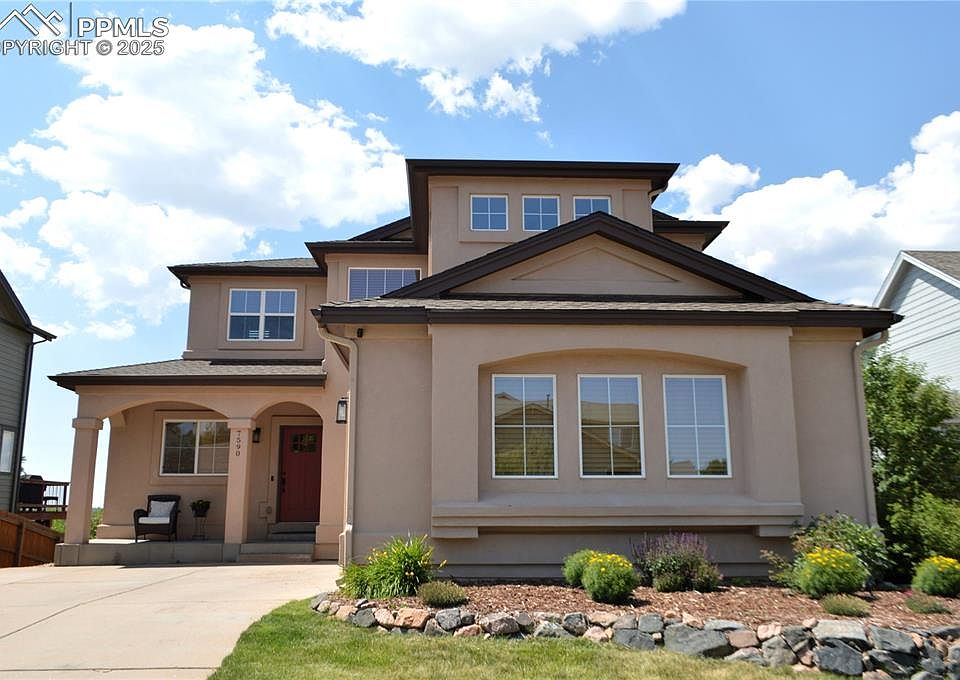 Discover this exceptional home in the highly desirable Woodmen Pointe neighborhood of Briargate, where stunning panoramic mountain views steal the show. Designed for easy, main-level living, the home offers a bright and open floor plan with a stylish kitchen, sunlit living and dining rooms, a private primary suite, and a laundry room on the main floor. Upstairs, you'll find two generously sized bedrooms, a full bathroom, and a versatile bonus room that can serve as a home office, playroom, or guest space. The newly finished walkout basement is a true highlight, featuring radiant floor heating, an additional living area, a fourth bedroom, a full bath, and a kitchenette with a large island, perfect for entertaining or multi-generational living. Outside, enjoy low-maintenance landscaping, an automatic sprinkler system, and a composite deck to take in the mountain and city views. Situated in the top-rated District 20 schools and close to trails and parks, this home blends comfort, convenience, and scenery in one perfect package.