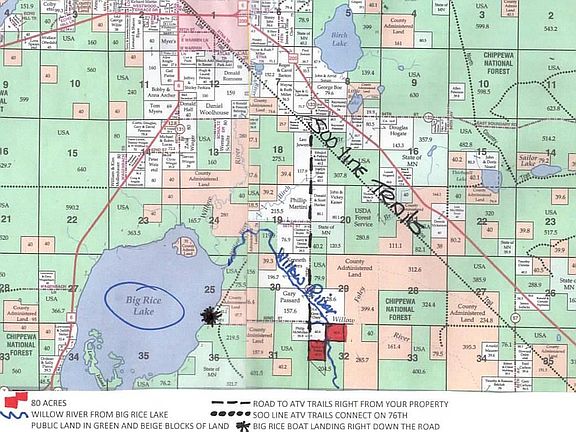 80 AC of hunter’s paradise. The land is a natural habitat for deer bear, grouse, of ducks and geese. The front 40 has established trails/deer stands and is ready for food plots. Easy access to the back 40 via state land. Hundreds of AC of public land for your use. Willow river flows through the property and connects to Big Rice Lake which is known for a variety of ducks on it’s water and the landing is only about 1 mile away. Big Rice also supports walleye, northern pike and large perch. Needless to say, there are also several fantastic fishing lakes near this property as well. The 1+ bedroom rustic hunting cabin has a wood stove and a propane heater. The cabin and outhouse are wired for generator powered electricity. Drive your ATV/snowmobile right from your property (less than 2 miles down 76th ) to the well-known Soo Line trails. There are 100’s of miles with many connectors. If you like to hunt, fish and trail ride, this is the property for you. Book your showing today!