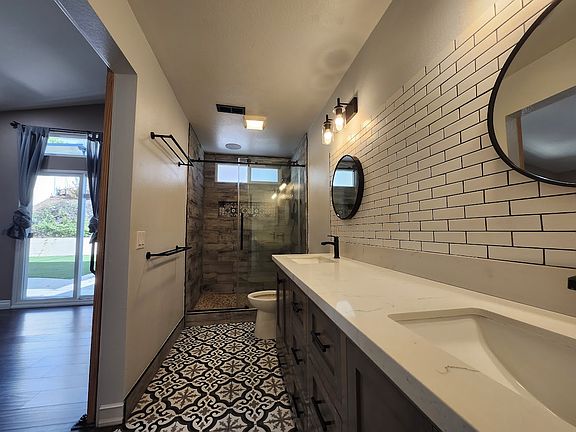 The additional bedrooms offer mirrored wardrobe doors, ceiling fans, and built-in custom closet organizers. Both bathrooms have been tastefully refreshed with modern vanities, solid-surface counters, and updated fixtures. The primary suite stands out with its custom pebble shower, dual sinks, and a private dressing area featuring a built-in closet system for clothes, shoes, and accessories. Durable LVP flooring throughout ensures easy maintenance.