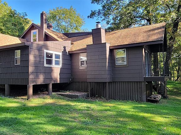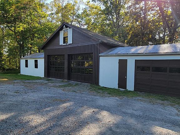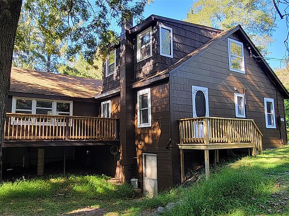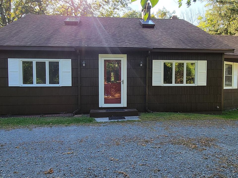 Cozy Cape! Come home to this nice 2 story house that features a living room with a fireplace, a dining area, a renovated eat-in kitchen, a den/office, a bright and sunny family room with high ceilings, a fireplace, and sliders that lead to the rear porch, also a bedroom with a walk-in closet, a small full bath, plus a half bath. The second floor has 2 additional bedrooms, one with a skylight and a lovely renovated bath with double sinks, a custom-made vanity, and plenty of storage. A full basement with a double soap-stone sink, laundry hook-up, and a workbench. Do you need storage? This home has it! There is a small 1 car garage and a 2 car garage with attic storage, PLUS a nice Quonset hut! Pretty property that has 3+/- country acres with a big backyard that is private and mostly wooded. Don't miss out, come and see this home today!