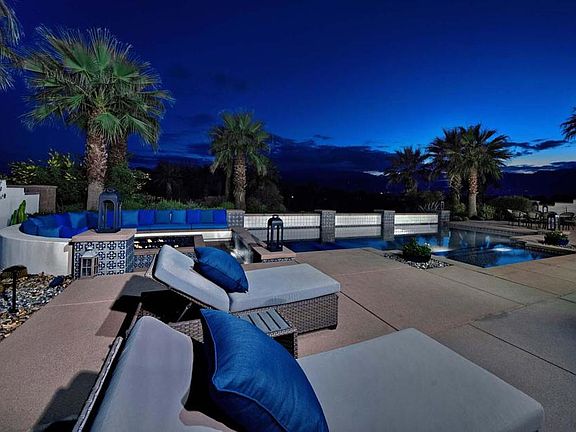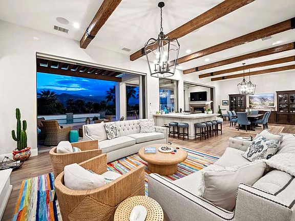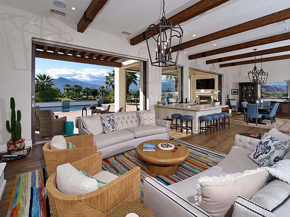 Welcome to this absolutely stunning Early California-style home, perfectly located on the 11th hole of our prestigious north course. This residence features unobstructed south-facing views, allowing you to savor breathtaking mountain vistas from various vantage points within the home and expansive outdoor leisure areas. Adding to its charm, the home boasts an owned solar system, ensuring energy efficiency and cost savings, while also contributing to a sustainable lifestyle. Vibrant pops of color throughout the interior create an inviting atmosphere, showcasing a harmonious blend of elegance and warmth. As you enter, you'll appreciate the impressive architectural enhancements, including an expanded kitchen with dual islands that inspire culinary creativity and effortless entertaining. The open-concept layout is designed for seamless living, accentuated by pocket sliders that invite natural light and connect the indoor spaces with the stunning outdoor environment. Step into the expansive backyard, a true oasis for relaxation and entertainment. Here, you will find ample leisure areas, a sparkling pool and spa for refreshing dips, and an oversized firepit that serves as a gathering focal point. The backyard also features a heater and fireplace under the veranda, ensuring comfort for outdoor enjoyment throughout the seasons, alongside a state-of-the-art water filtration system for pure, refreshing hydration at your fingertips. Finally, immerse yourself in the ultimate audio experience with the Sonos audio system, allowing you to set the perfect ambiance throughout your home and outdoor spaces. This remarkable home offers a unique blend of sophistication, comfort, and picturesque views, making it the perfect retreat for anyone looking to embrace the Southern California lifestyle. Don't miss this opportunity to make it your own!