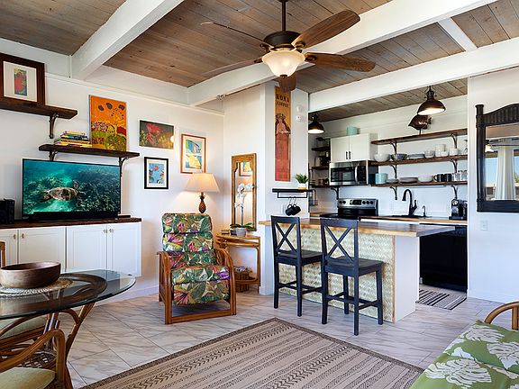 Top floor units have open beamed ceilings and an additional side window allowing extra air flow and light. Sit on your lanai overlooking Alii Drive and watch the Ironman runners go by! The unit is across the street from the ocean-side complex where there is there is a saltwater pool, spa, inviting lobby and the beach! Explore the tide pools or pull up a chair and watch the sunset as well as the surfers at the famous Banyans surf spot. BBQ's, picnic tables and lounge chairs are all provided. In addition, there is a trolly stop right out front which will take you into town.