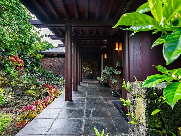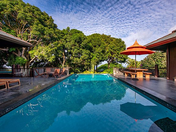 76-874 Io Kualua Pl — an architectural masterpiece in Kona.<br><br>Majestic lava rock walls set the stage for a dramatic arrival, leading to an Asian-inspired colonnade entry that whispers serenity. Step through the doors into a world of Balinese pod-style architecture, where living pavilions are gracefully arranged around an infinity-edge saltwater pool, cascading over a stone temple wall—an unforgettable centerpiece of tropical design.<br><br>This residence evokes the feeling of a treehouse suspended in nature, seamlessly merging luxury with the jungle canopy. A spectacular chef’s kitchen and generous entertaining spaces invite gatherings, while two detached upper-level bedroom suites—with full baths and a dedicated laundry—provide privacy and retreat.<br><br>Every detail reflects rare artistry: French copper roof and gutters, rich redwood siding, and Brazilian cherry hardwood floors. Handcrafted mahogany pocket doors, windows, built-in beds, expansive wardrobes, and custom cabinetry showcase craftsmanship seldom seen. Granite surfaces accentuate the interiors with understated opulence.<br><br>Designed as the final project of acclaimed architect Robert Nespor, this estate was extensively and meticulously renovated between 2020 and 2023. The spacious downstairs bedroom offers you the perfect hosting site for visiting friends or family, with private entrance, Additional luxuries include an air-conditioned cinema, expansive workshop area and an additional unrecorded guest suite with private entry. Parking accommodates up to five vehicles with ease.<br><br>Beyond the architecture, the land flourishes. A vibrant orchard produces mango, lychee, two varieties of avocado, Meyer lemon, Tahitian lime, pineapple, and a wide array of tropical delights—a bounty at your doorstep.<br><br>Exotic. Glamorous. Singular. A true statement property, unlike any other.