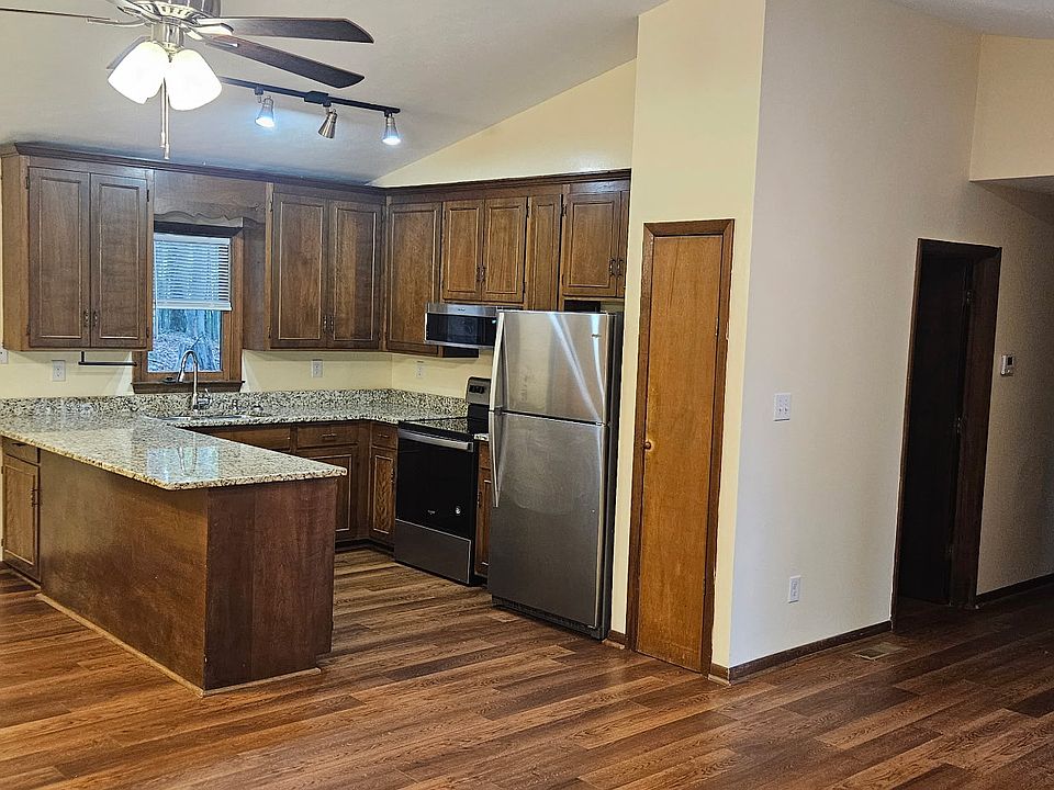 - Kitchen with stainless steel appliances, granite countertops, and bar seating