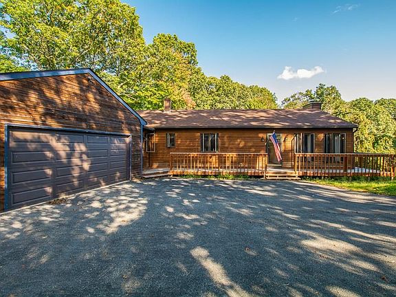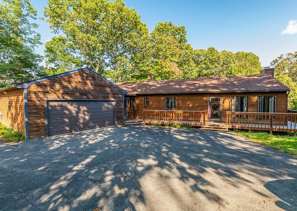 Great custom built 3 bedroom, 3 full bathroom single level living Ranch in Smithfield. With an open & inviting floor plan that includes a stone fireplace, sliders to a large wrap around deck for relaxing views of the private back yard with plenty of shade from an electronic awning, master bedroom en-suite, two additional bedrooms with ample closet space, eat in kitchen with a dining area, wrap around driveway, all tucked away on nearly two private acres. There is also additional living space in the basement, including a full bathroom and full workshop, as well as a two car garage with entry into a mud room.