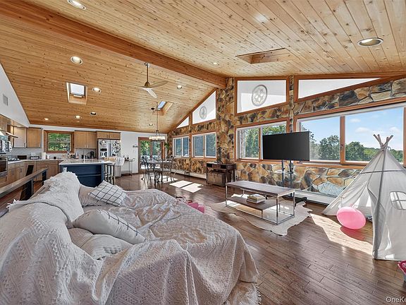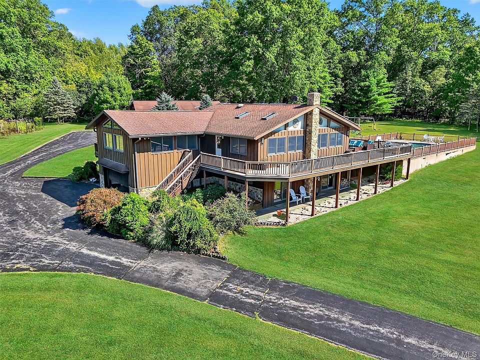 Set high on a rolling hilltop, this stunning contemporary ranch offers panoramic views that stretch for miles. From sunrise to sunset, enjoy breathtaking scenery from the expansive wrap-around deck, the private deck off the primary suite, or while relaxing by the sparkling above-ground pool.