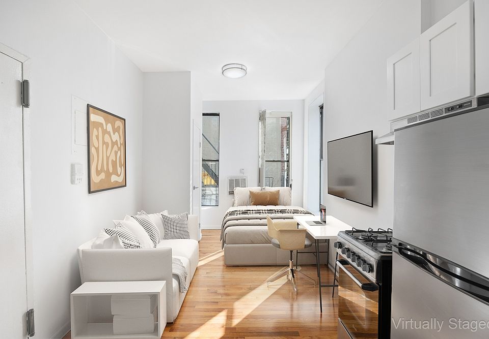 Great sunny renovated studio with hardwood floors, exposed brick & decorative fireplace. Full & kitchen.