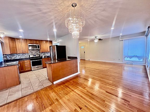 Stunning 3 bedroom, 2 bathroom, split-level home is located in the desirable South Suburban Chicago Heights, offering a perfect blend of modern updates and classic charm. Step inside to discover beautiful hardwood floors that grace the main level and all three spacious bedrooms. The recently remodeled full bathroom is a true standout, featuring a sleek smart mirror above the vanity, dark navy cabinetry, and floor-to-ceiling glossed ceramic tile. The high-end finishes include black onyx glass shower doors, gold hardware, and a crisp white countertop that complements the grey wall tiles, creating a stylish and serene space. The well-appointed kitchen boasts stainless steel appliances, including a range, microwave, refrigerator, and dishwasher. The soft brown-toned cabinetry pairs beautifully with the dark granite countertops, making this kitchen both functional and aesthetically pleasing. This home is enhanced with modern light fixtures, including a chandelier in the dining room and ceiling fans in the living room and each bedroom for added comfort. You'll also appreciate the newer white vinyl windows throughout the main and upper levels, allowing plenty of natural light to flow throughout the home. The attached two-car garage provides ample storage space, and there's so much more to see in this move-in-ready property. Don't miss out on this fantastic opportunity to make this house your new home. Schedule a tour today