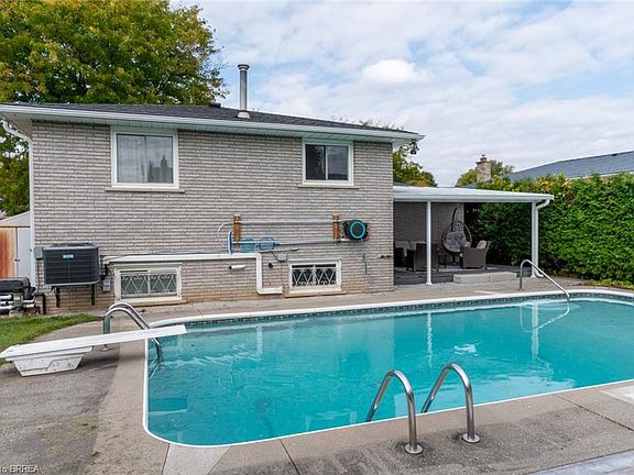 North End all angelstone brick raised ranch style family home with wide 57 ft frontage lot & heated inground pool for summer fun steps to schools! Featuring open concept newer stunning eat-in kitchen, dining room & living room with hardwood floors- perfect for entertaining! 2+1 bedrooms, 2 full baths, could have 4th bedroom on lower level if needed, finished rec room with gas fireplace and built in book shelves with desk, nice covered sun screen deck that blocks UV sunlight, newer windows with 2 bay windows in living room & dining room, newer reshingled roof, furnace, central air, newer insulation, all TV's stay, most furniture is also negotiable, all appliances included, double paved driveway, atttached garage with auto opener, security system, fenced yard. Close to shopping and easy Hwy 403 access just off the Wayne Gretzky Parkway. Room to park RV or trailer on side of home with gravel base. Immediate possession. A Must See!