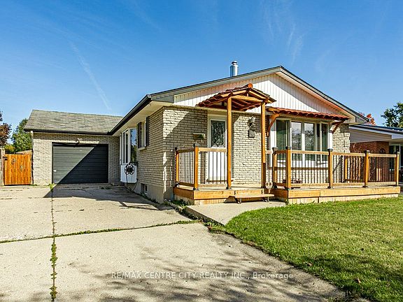 Welcome to 76 Fitzroy Place. Situated minutes from White Oaks Mall, restaurants, medical centres, the 401 and directly opposite Nicholas Wilson PS, this 3+1 bedroom, 2 bathroom bungalow is on a large corner lot. The double wide driveway and attached single car garage allows ample room for parking cars. Inside the main level you'll find light engineered wood flooring throughout the spacious and bright living/dining area and in all of the 3 good sized bedrooms. Modern and neutral ceramic tiles make up the flooring in the renovated kitchen. The main bathroom is renovated in neutral grey tones with new vanity, toilet and ceramic tiled shower with caddy. In the lower level, enjoy a large recreation room, full 4 piece bathroom with jacuzzi tub and additional bedroom. Outside, enjoy the raised deck with gazebo, swing and firepit for summer entertaining. Some updates include: Flooring (2021), Kitchen (2023), Roof (2008), Front porch (2021-2), Rear Deck (2021-2)