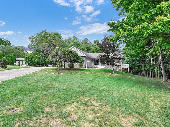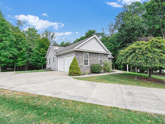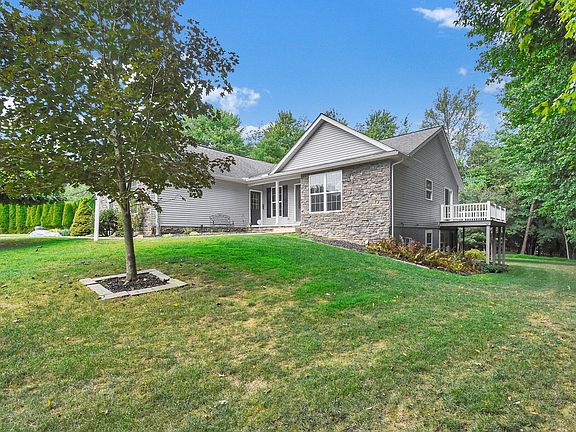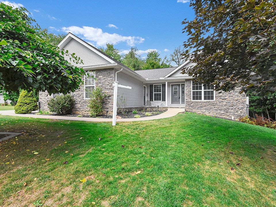 This charming ranch home features a vinyl and stone exterior with inviting curb appeal. Inside, cherry wood trim, doors, and cabinetry add warmth throughout, including the hardwood-floored dining room. The kitchen offers stainless steel appliances, and the bright living spaces are enhanced by large windows and sliding doors, providing abundant natural light. The primary bedroom boasts an en-suite with a sliding door shower, double sinks, and ample storage. Carpeting in the bedrooms and living room adds a cozy feel, and adds warmth and comfort of the home. Enjoy outdoor living on the open deck with easy access to the yard. Additional highlights include main-level laundry and a basement with concrete floors, ideal for storage or your creative touch. Do not miss this beautiful home FOR '