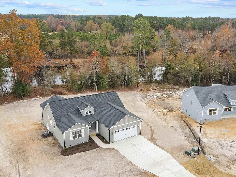 Welcome to your tucked away, tranquil oasis! This charming ranch-style home is nestled on the banks of a serene pond, offering breathtaking views and a sense of peace and privacy. The property boasts numerous upgrades, including designer picked finishes, prewired security system, doorbell camera, granite countertops, and much more! Step inside to find a private foyer that leads you into open living with vaulted ceilings creating an airy ambience with an abundance of windows for natural light and POND VIEWS! Your primary is grand with an accent wall, custom walk in closet, dual sinks and a walk in tiled shower! 19 miles to Fort Liberty for an easy commute!