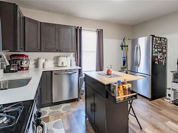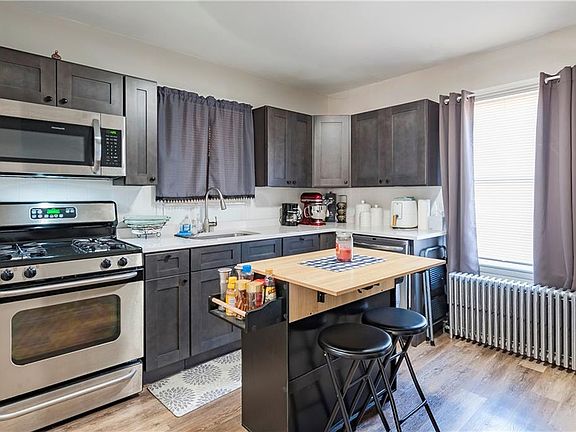 A series of incredible renovations has shaped this meticulously maintained East Providence residence into the modern home of your dreams! Enviably set on a corner lot in a peaceful neighborhood, this 3-bedroom, 1-bath haven greets you with a flagstone path leading to a wrap-around, elevated covered porch ideal for getting acquainted with passing neighbors. Enter into a warm, welcoming interior finished with high ceilings, refined millwork, neutral tones, and newer wide-plank flooring throughout. Unwind in the comfortable living area or savor memorable gatherings in the sun-filled dining room which features elegant coffered ceilings. Remodeled in 2023, the large kitchen is equipped with stainless steel appliances, custom cabinetry, and gleaming countertops. Upstairs, three carpeted bedrooms await you after a long day, each well-sized for relaxation. A refreshing full bath accommodates these personal quarters. Outside, an enclosed patio offers a great spot for weekend BBQs no matter the season, with a sprawling yard beckoning you to enjoy endless fun under the sun. Additionally, there’s ample storage, updated roofing and deck, upgraded electrical service including a 200-amp panel, and on-site parking for multiple vehicles on the recently repaved driveway. A fantastic location close to schools, shopping, restaurants, parks, various sports fields, the ferry terminal, and highways 195 & 95 ensures total convenience. Come grab this opportunity while it’s still available!