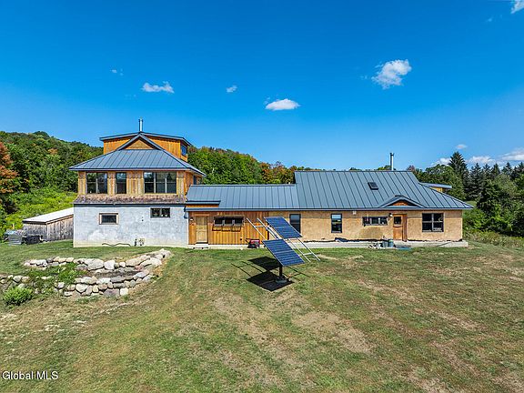 This ecologically friendly 4+ bedroom home blends creativity and sustainability with its strawbale construction, unique design, light-filled rooms, and a flexible floor plan. The eat-in kitchen, with cathedral ceilings, centers around a striking Finnish contra-flow masonry heater with a built-in pizza oven. The main living area also offers a cozy loft, pantry, full bath, living room, utility room, and a spacious mudroom. The first-floor primary suite has its own exterior access and an adjacent bath, currently a half bath but plumbed for a walk-in rain shower and soaking tub. Upstairs, you'll find three bedrooms, a half bath, and an office, plus a third-floor studio or game room. Radiant floor heating is a welcome reprieve from winter's chills. An intricate masonry patio welcomes you to the home, while 7.8 private acres of mostly open meadow provide ample space for homesteading, animals, or simply enjoying the outdoors. Established gardens, a small pond, and two outbuildings enhance the setting. Perfectly situated, the property is just minutes from Cossayuna Lake, Carter's Pond Wildlife Area, and the Battenkill, and less than 45 minutes to Saratoga Springs, NY, or Manchester, VT. With a few finishing touches, this one-of-a-kind property is ready to become your ideal full-time residence or spacious vacation retreat, offering plenty of room for family and friends.