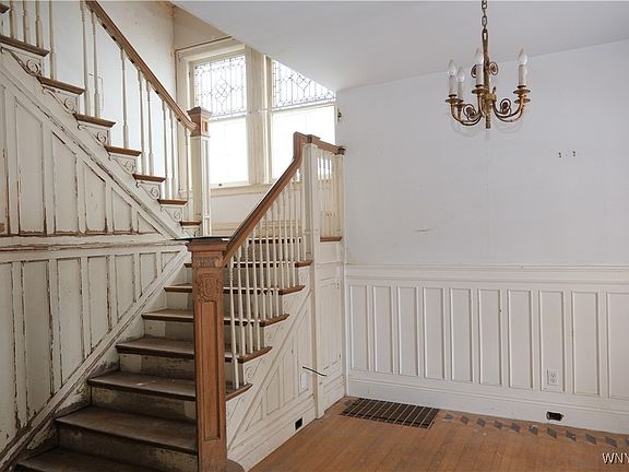 The property will require a new roof and extensive interior work but includes a newer furnace and hot water tank. The home is eligible for New York State Historic Homeowner Tax Credits, offering a 20% credit on approved rehabilitation work.