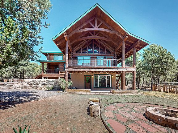 Beautiful custom built log cabin for sale on 5 gorgeous tree covered acres. The home features 5 bedrooms, 4 1/2 baths, chef's kitchen, expansive floor plan, a recently built workshop/studio, and expansive deck great for entertaining. The home is constructed using builder chosen 6-18 inch logs and features two in-home sprinkler systems. The property contains incredible landscaping and has potential for horses with ample storage and barns. There are two legal lots of record, a private well with water rights, chicken coop, greenhouse, fruit trees, sophisticated playground equipment, healthy Piñon, Juniper trees, custom rock retaining walls, and graveled driveway. Conveniently located 30 minutes from downtown Santa Fe, this incredible property combines the best of rural living with easy access to amenities. Set up a showing today!