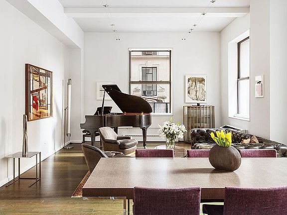 Jaws drop and spirits rise as you enter the great room -- a lofty space worthy of the name. Here, under the highest ceilings in the building, just off off the private-keyed elevator landing, surrounded by the biggest windows in the building, is a majestic entertaining room. This is the storied space that has been treasured since 1911 -- the showroom -- and it still is. With epic wall space ideal for art, with bright natural light courtesy of its stunning signature windows, and with ample room for a grand piano and multiple seating areas, this lofty living room is dramatic and impressive, creative and comfy, and wonderfully inviting. The open-plan dining area is served by the open-plan cook's kitchen -- with a massive stone-clad dining bar, with generous cabinets and pantry space, and with a premier suite of top-shelf appliances by Subzero and Miele (including wine fridge).